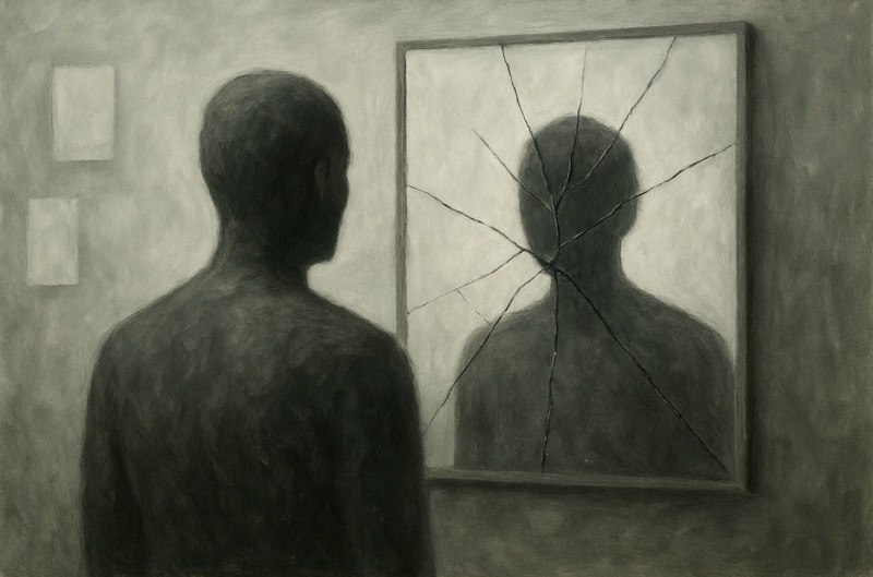 Une figure centrale – silhouette de soliloque – se reflète dans un miroir brisé : l’un renvoie la posture grandiose d’une nation héritière des Lumières, l’autre déconstruit sa façade. Les vestiges d’un État autoproclamé phare culturel se désagrègent en fragments psychologiques et bureaucratiques.