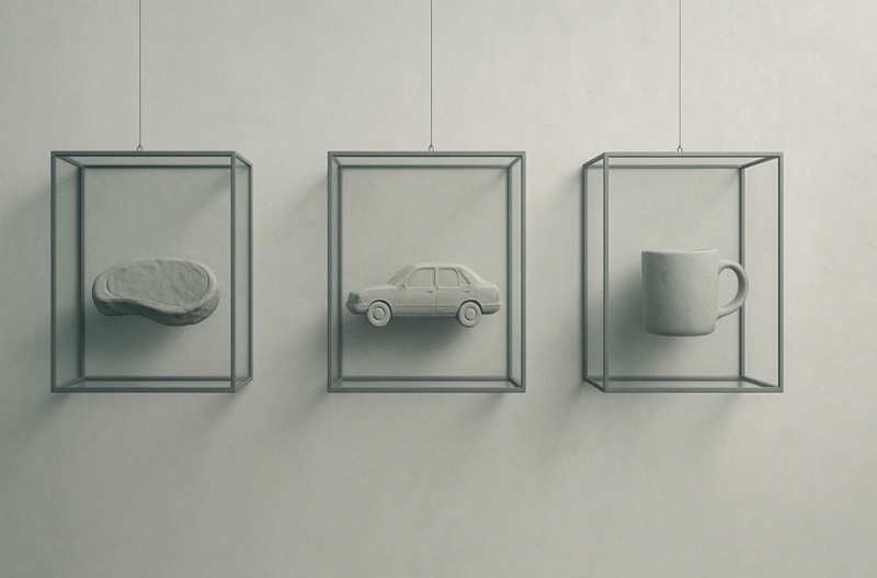 Cette installation explore le conformisme mental comme une cage temporelle. À travers des vitrines suspendues, on y découvre des objets familiers, une tranche de steak, une voiture abandonnée, une tasse à café usagée , sculptés en résine gris-pâle. Chaque objet incarne des reliques de prestige social figé, des vestiges d’un passé où la rareté façonnait le sens.